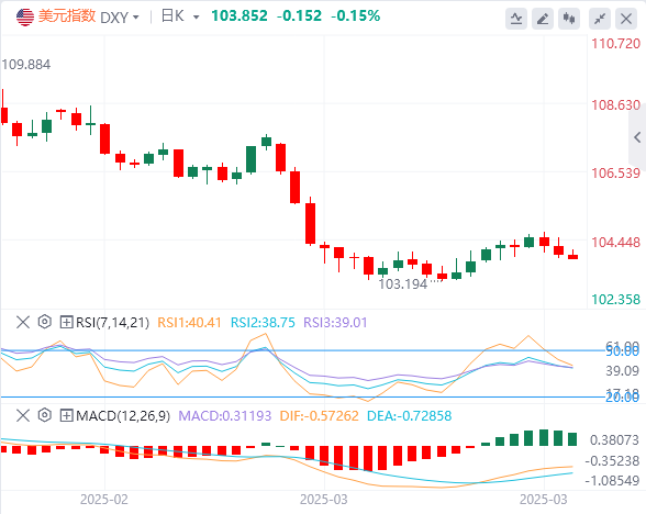 美元指数:截止发稿,美元指数徘徊在103.85附近。美国2月份核心PCE上涨0.4%,高于预期的0.3%,这加剧了人们对美国持续存在的通胀担忧。总体PCE增长率为0.3%,符合预期,没有给交易员带来重大意外。特朗普最近宣布的关税举措,包括从4月2日起对汽车征收25%的关税,扰乱了全球贸易情绪。欧盟官员警告称,如果关税按计划实施,欧盟将做出“有力且及时”的回应。技术面上,如果美元指数收于50MA下方104.04,它将向位于103.20–103.40区间的下一个支撑位移动。