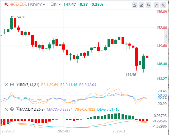 美元/日元周一上涨超过0.5%,但未能保持看涨势头。截至发稿时,该货币对当日下跌0.5%至147.10。日本首相石破茂周一表示,他们将继续推动美国审查关税政策,并指出他正在考虑在适当的时候访问美国,与特朗普进行直接对话。