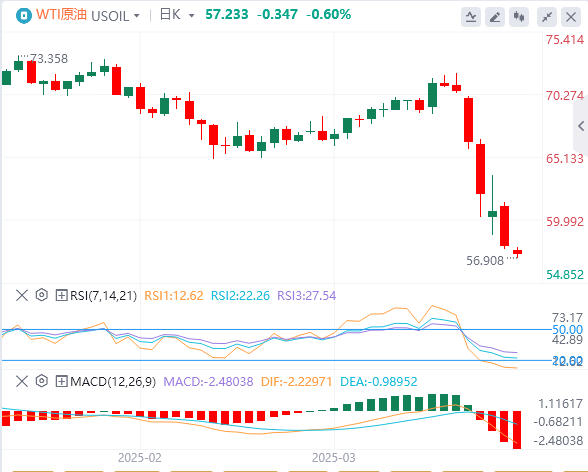 周三亚盘,原油交投57.23附近。国际原油价格大幅下行,尽管全球股市出现反弹,但中美贸易冲突升级所引发的全球经济衰退担忧主导市场情绪,导致油价回落至四年来最低水平。据白宫官员透露,美国将自周三凌晨起对来自中国的进口商品加征104%关税,因中国未在特朗普设定的周二中午最后期限前撤销34%的反制关税。
