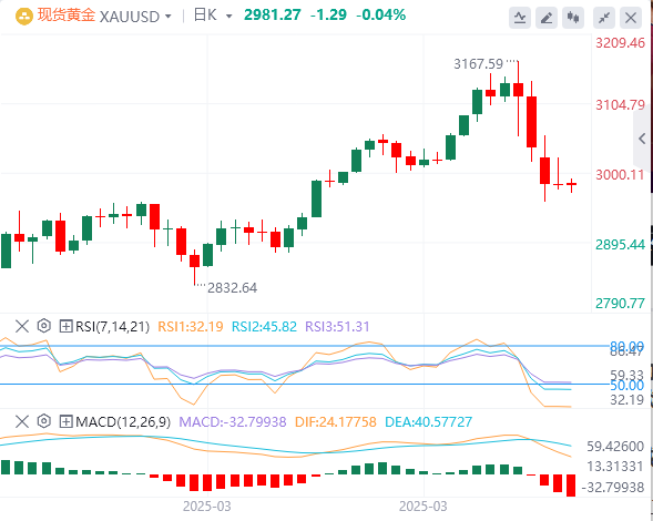 周三亚盘,黄金交投2981.27附近。前一交易日,金价反弹受阻,盘中一度冲高至3022美元,但受美债收益率攀升及美股下跌拖累,最终回吐涨幅,收报2982附近。尽管美元走软和贸易紧张局势为黄金提供避险支撑,但市场对美债标售需求疲软、美联储政策前景及股市波动加剧的担忧仍主导短期情绪。