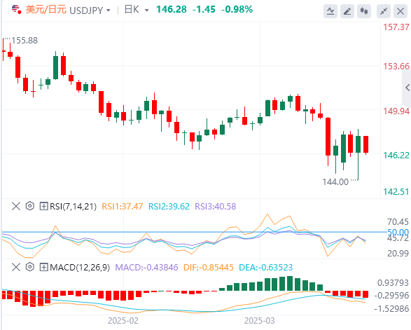 美元/日元在周三上涨1%后,周四逆转方向,交投于146.50附近,日线下跌约0.9%。