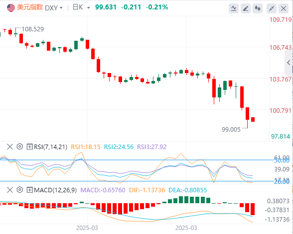 美元指数:截止发稿,美元指数徘徊在99.63附近。美元指数在上周五的交易中继续下滑,跌至接近100区域,此前在当天早些时候创下三年新低。下行趋势反映出投资者信心的广泛恶化,因为最新数据和央行评论描绘了美国经济的阴暗前景。密歇根大学的消费者信心指数在四月份大幅下跌,而生产者价格指数低于预期,进一步加剧了市场的通货紧缩担忧。几位美联储(Fed)官员指出,通胀预期上升构成风险,尽管短期经济数据暗示需求正在减弱。从技术角度来看,美元指数正试图收于阻力位100.20–100.40上方。如果这次尝试成功,美元指数将走向下一个阻力位,即位于101.70–101.90区间。