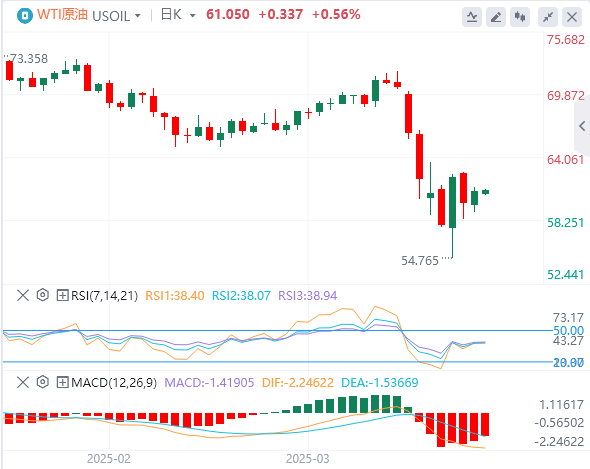 周一亚盘,原油交投61.05附近。由于美国能源部长克里斯·赖特(ChrisWright)表示,美国可能会全面切断伊朗的原油出口,以迫使伊朗就其核计划让步,国际油价大幅上涨逾1美元。美国能源信息署(EIA)周四下调了全球经济增长预期,并警告称关税可能对油价构成沉重打击。该机构还下调了今年和明年美国及全球的原油需求预估。