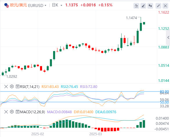 技术面:金价上周收于历史高位,涨幅超过6.5%,前景依然看涨。通胀风险上升、美元走弱以及央行需求增长,继续支撑金价上涨势头。除非贸易紧张局势得到有效解决,或市场对美国财政政策的信心恢复,否则黄金的需求可能仍将持续。