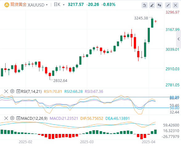 周一亚盘,黄金交投3217.57附近。金价下跌,打破了周五创下的三天创纪录的3,245美元的历史高点。避险资金流动似乎有所缓解,因为交易员对华尔街周五的转机以及美中关税战的一些积极消息感到欣喜,暂时缓解了金价的看涨压力。