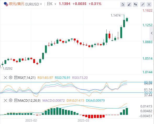欧元/美元在上周上涨超过3.5%后,在欧洲早盘于1.1400附近交投于积极区域。欧盟统计局将于周二公布2月份工业生产数据。