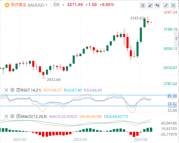 周二亚盘,黄金交投3211.88附近。金价周一冲高回落,在盘中稍早刷新历史高点至3245.51后回落,收盘下跌0.85%至3210.39美元/盎司,因白宫豁免多数国家电子产品高额关税后,风险情绪有所改善。
