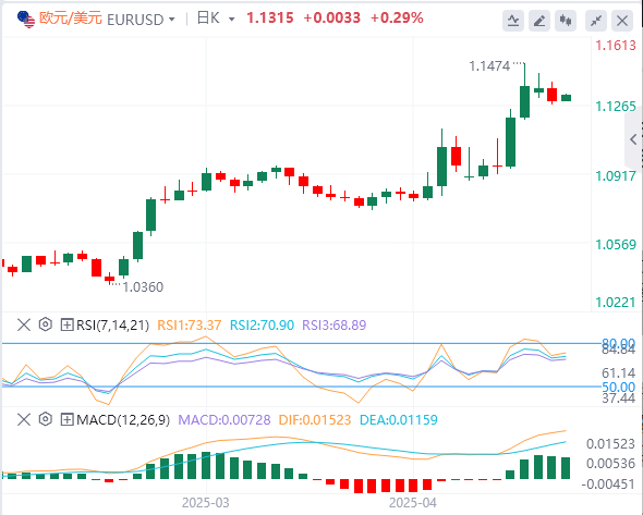 技术面:黄金自2025年1月初至今一直保持在一个完美的上升通道中运行,近期突破3170.00美元关键阻力后迅速攀升至历史新高3245.51美元。目前价格在上升通道中轨上方运行,表明中期趋势仍然强劲。日线RSI读数为68.35,接近超买区域但尚未进入极端超买区间。MACD指标保持金叉状态,DEA线与DIFF线距离扩大,显示中长期多头动能仍在增强。日线图的CCI指标为129.81,达到超买水平。中期来看,上升通道下轨和3170.00美元位置构成重要支撑区域,而上方阻力则依靠通道上轨延伸线指引。