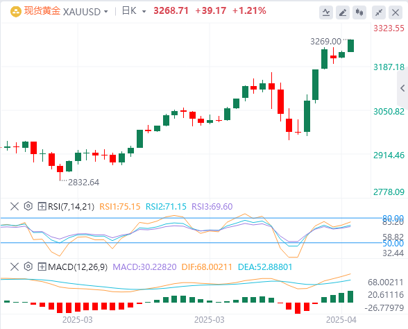 周三亚盘,黄金交投3268.71附近。现货黄金短线突然暴涨,金价突破3260美元/盎司大关,日内涨幅超过30美元。美国彭博社周三最新报道称,随着特朗普政府推进可能扩大贸易战的调查,刺激了对避险资产的需求,金价创下历史新高。