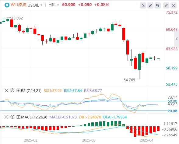 周三亚盘,原油交投60.90附近。国际油价大幅回落,单日跌幅接近每桶3美元,基本回吐前一交易日的全部涨幅。投资者重新评估美国“关税暂停”措施的实际影响,同时将焦点转向美中贸易战的持续升级。在此前的周三,由于美国总统唐纳德·特朗普(DonaldTrump)宣布暂缓对数十个贸易伙伴加征惩罚性关税,两大原油期货一度上涨超过每桶2美元。但这一转向仅在关税生效不到24小时后即发生“急刹车”。