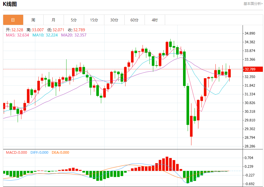 现货白银:截止北京时间20:20,现货白银上涨,现报32.787,涨幅0.93%。纽市盘前,白银价格在盘中的最后一个交易中上涨,受EMA50上方交易的支撑,并伴随着(RSI)上的积极信号,以攻击32.90美元的顽固关键阻力,其中短期看涨修正趋势占主导地位。