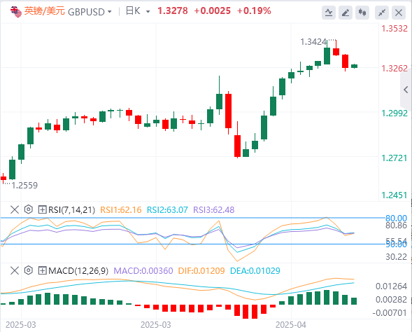 英镑:截止发稿,英镑/美元徘徊于1.3279附近。由于交易员在评估喜忧参半的英国经济数据和不断变化的美联储政策预期,英镑兑美元的涨势已经暂停。虽然近期可能会出现回调,但如果关键支撑位保持住,从更广泛的趋势来看,可能会再次出现上涨。技术指标表明,在下次决定性行动之前,市场将进一步盘整。技术面上,如果英镑/美元成功收于50MA下方,它将走向下一个支撑位,即位于1.3180–1.3200区间。
