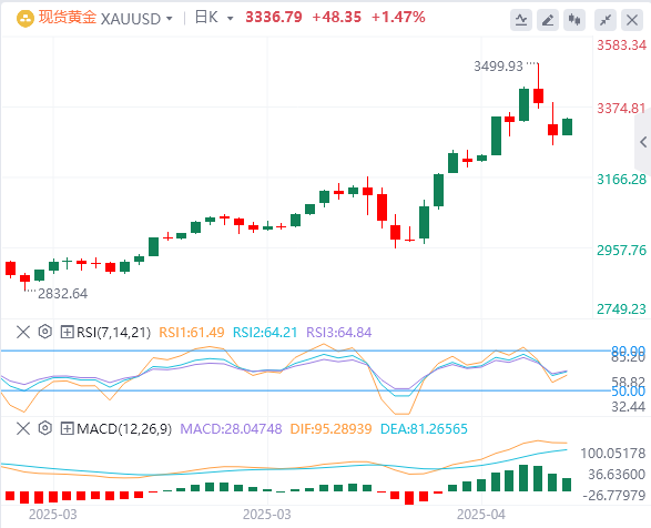 技术面:从技术面看,黄金日K线图显示当前价格已显着脱离近期高位,进入调整阶段。截至周三,50周期均线位于3033.82美元,远低于当前报价,表明中长期趋势仍偏上行。然而,短期内,价格快速上涨后的获利回吐压力明显。相对强弱指数(RSI14)当前报63.76,已从前几日的超买区域(70以上)回落至正常交易区间,暗示市场过热情绪正在消退。业内分析师指出,RSI若进一步回落至50附近,黄金价格可能测试3167美元的4月初关键支撑位。展望未来,黄金市场将在基本面和技术面的双重影响下维持高波动性。短期内,特朗普温和表态引发的避险情绪降温可能继续施压金价,3282美元和3167美元的支撑位将成为关键考验点。若这些水平失守,市场可能进一步下探至3100美元附近的中期均线支撑。反之,若美元走弱或地缘政治风险(如俄乌局势)再度升温,黄金可能迅速反弹,挑战3415美元甚至更高阻力。