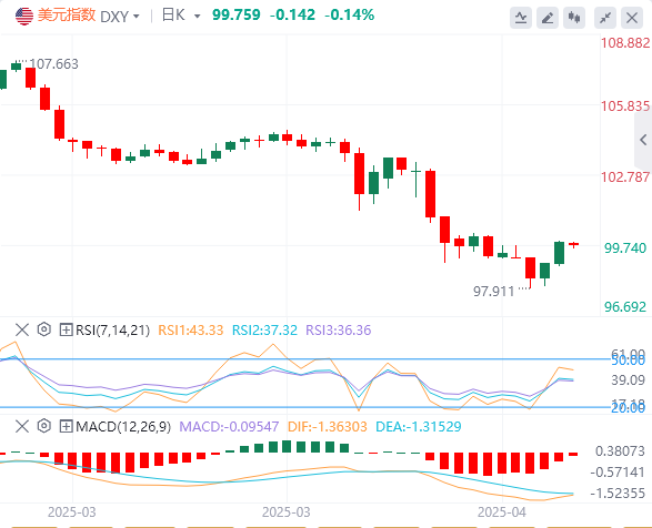 美元指数:截止发稿,美元指数徘徊在99.75附近。市场波动源自美国总统特朗普的言论,他表示不会解雇美联储主席鲍威尔(尽管对高利率政策表示不满)。特朗普的言论让市场对美国政策产生一定疑虑,进而影响美元走势。日线图上,美元指数的走势显示出一定的弱势,近期价格未能突破上方的101.00水平,并且持续在较低的区间震荡。技术面上,美元指数收于99.39的50MA上方,并试图收于99.70上方。如果这次尝试成功,美元指数将朝着下一个阻力位100.20–100.40移动。