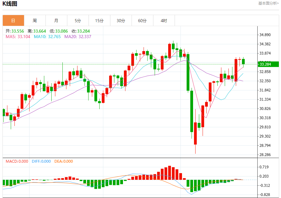 现货白银:截止北京时间20:20,现货白银下跌,现报33.290,跌幅0.78%。纽市盘前,白银价格经历了平静的早盘交易,随着(RSI)上负面信号的出现,导致其下跌,试图获得可能有助于其恢复和再次上涨的积极动机,在短期基础上沿着看涨的修正趋势线交易。