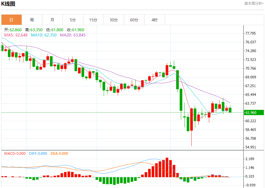 原油市场:截止北京时间20:20,美油下跌,现报61.940,跌幅1.35%。纽市盘前,原油价格在最近的盘中交易中下跌,受当前阻力位63.20美元的稳定影响,依靠EMA50的支撑,与价格走势相比,在达到夸大的超买水平后,开始在(RSI)上出现负面重叠信号,加强了价格的负面压力,特别是受短期基础上形成的负面模式(即上升楔形模式)的影响。