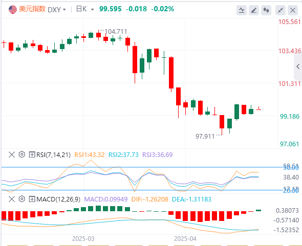 美元指数:截止发稿,美元指数徘徊在99.59附近。基本面可能是美元近期的主要驱动因素,特别是美国总统特朗普态度的转变。美国财政部长贝森特评论称,与其他经济体的贸易紧张关系有可能缓和,并补充说若与其他经济体达成贸易协议,关税将大幅降低,这一点也得到了特朗普的证实。此外,美国总统不再进一步攻击美联储主席鲍威尔,这减轻了对美联储降息的压力,从而可能使其对美元发挥支持作用。技术面上,如果美元指数回到99.50水平下方,它将向最近的支撑位98.80–99.00区间移动。