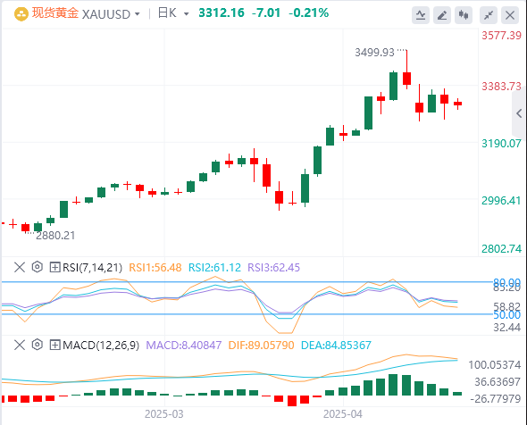 4月28日,北京时间周一五亚市早盘,美元指数徘徊在99.59附近。上周五,在对全球贸易紧张局势缓和的希望推动下,美元指数走高,最终收涨0.325%,报99.61,并结束四周连跌。美债收益率继续回落,基准的10年期美债收益率收报4.24%;对货币政策更敏感的两年期美债收益率收报3.744%。鉴于避险情绪降温和美元坚挺,现货黄金回落,最低触及3265.2美元/盎司,最终收跌0.9%,报3318.2美元/盎司,为对等关税宣布以来首次周线收阴。现货白银盘中再次失守33关口,尾盘有所反弹,最终收跌1.46%,报33.08美元/盎司。由于关税谈判的不确定性仍存,国际原油连续第二日小幅上涨。WTI原油再度触及63关口,最终收涨0.57%,报62.98美元/桶;布伦特原油收涨0.38%,报65.91美元/桶。