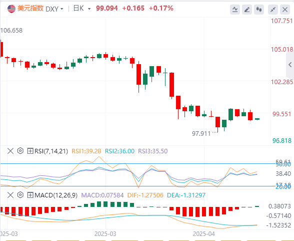 4月29日,北京时间周二亚市早盘,美元指数徘徊在99.09附近。周一,美元指数回落,尾盘失守99关口,最终收跌0.687%,报98.93。美债收益率延续跌势,基准的10年期美债收益率收报4.211%,创三周新低;对货币政策更敏感的两年期美债收益率收报3.701%。随着逢低买盘的介入,现货黄金盘中由跌转涨,一度重回3350美元关口,最终收涨0.79%,报3344.26美元/盎司。现货白银涨势相对较弱,最终收涨0.25%,报33.16美元/盎司。国际原油结束两日连涨,美盘跌幅扩大。WTI原油跌破62美元关口,最终收跌2.06%,报61.68美元/桶,创近两周新低;布伦特原油收跌1.97%,报64.61美元/桶。