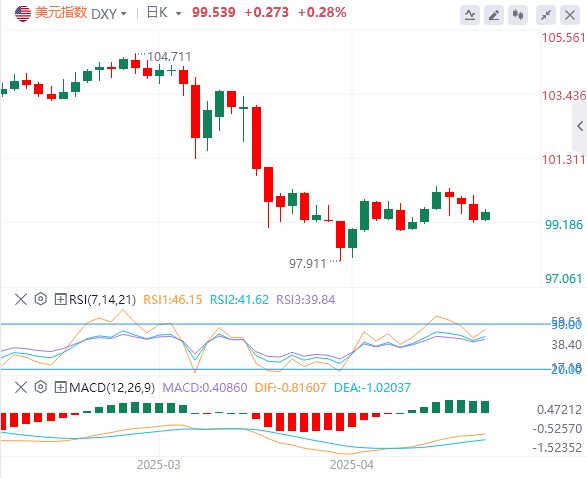 5月7日,北京时间周三亚市早盘,美元指数徘徊在99.53附近。周二,因美国3月贸易逆差扩大至创纪录的1405亿美元,美元指数全日震荡下行,最终收跌0.54%,报99.24。基准的10年期美债收益率收报4.3020%;对货币政策更敏感的两年期美债收益率收报3.7910%。因美国可能对进口药品征收关税,亚洲买家节后重返黄金市场,现货黄金周二再度大涨近100美元,最终收涨2.85%,报3431.11美元/盎司;周三亚盘初,黄金日内跌近1%,早盘跌近30美元,下触3400美元/盎司。现货白银周二收涨2.33%,报33.22美元/盎司。因亚欧需求增加、美国产量下降,以及以色列再度升级局势,国际油价大涨。WTI原油最终收涨3.18%,报58.97美元/桶;布伦特原油收涨2.84%,报62.01美元/桶。