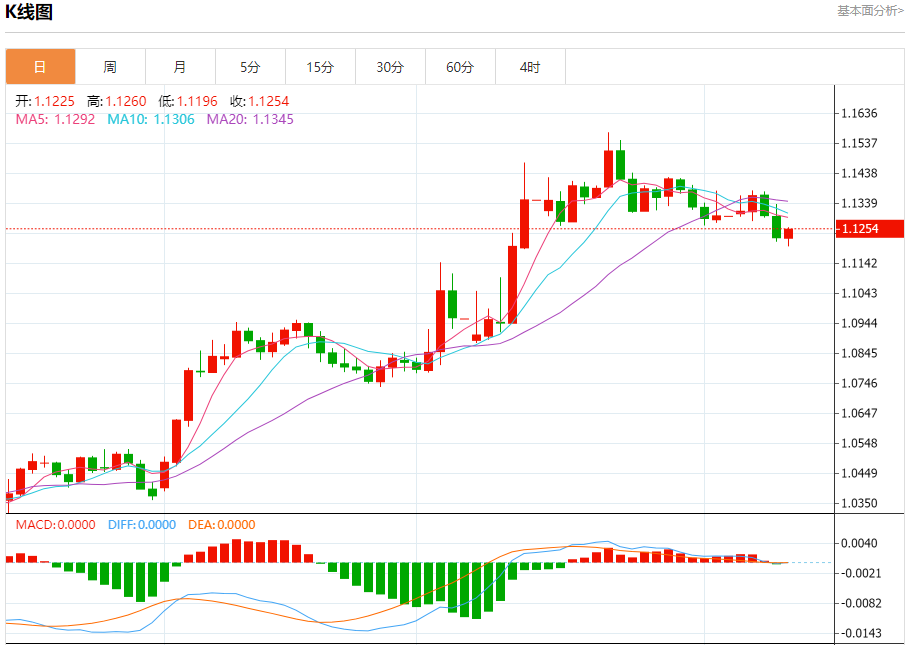 欧元/美元:截止北京时间20:18,欧元/美元上涨,现报1.1256,涨幅0.25%。纽市盘前,欧元兑美元在最近的盘中交易中下跌,确认突破了1.1260的关键支撑,加强了短期主导的熊市修正趋势的延续,价格沿着斜线交易。