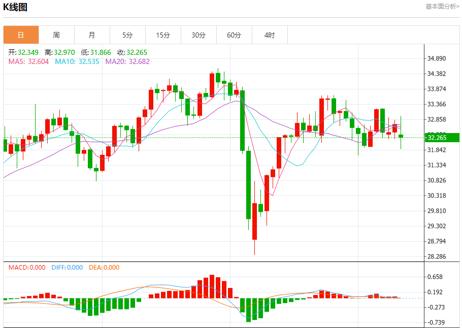 现货白银:截止北京时间20:20,现货白银下跌,现报32.301,跌幅1.22%。纽市盘前,(白银)价格在最近一个交易日下跌,受当前阻力32.70美元稳定性的影响,在短期基础上测试了一条熊市趋势线后,随着(RSI)上负面信号的出现,在达到超买水平后,面临着因交易低于EMA50而导致的负面压力,达到我们早上的目标31.90美元。