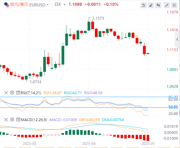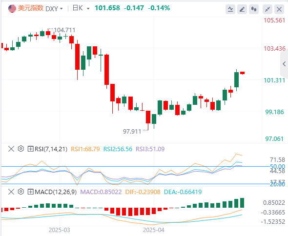 5月13日,北京时间周二亚市早盘,美元指数徘徊在101.65附近。周一,因中美达成削减关税协议,缓解了市场对美国经济衰退的担忧,美元指数一度逼近102,最终收涨1.37%,报101.80。基准的10年期美债收益率收报4.4740%;对货币政策更敏感的两年期美债收益率收报4.0350%。受中美经贸会谈消息影响,现货黄金一度跌破3210美元/盎司,最终收跌2.73%,报3235.58美元/盎司。现货白银最终收跌0.43%,报32.58美元/盎司。因中美以积极的态势结束贸易会谈,国际油价一度大涨3%,但OPEC的增产计划限制了涨幅。WTI原油最终收涨1.52%,报61.92美元/桶;布伦特原油收涨1.68%,报64.95美元/桶。