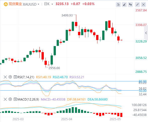 周二亚盘,黄金交投3235.13附近。金价周一下跌超过3%,此前美中周末讨论后风险偏好有所改善,双方同意降低90天的关税。华尔街在美中协议之后取得了收益,根据该协议,两国都降低了关税,并同意在瑞士会晤后继续进行进一步谈判以达成贸易协议。
