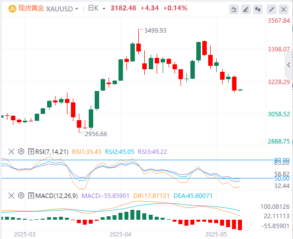 周四亚盘,黄金交投3182.48附近。由于风险偏好改善和贸易谈判取得进展,黄金的潜在上行空间可能在短期内受到限制。随着全球贸易战紧张局势的缓和,贵金属仍处于守势,迫使投资者远离避险需求。美国和中国在瑞士日内瓦进行了为期两天的谈判后同意降低对彼此的关税。美国将中国进口商品的关税从145%降至30%,而中国将美国进口商品的关税从125%降至10%。