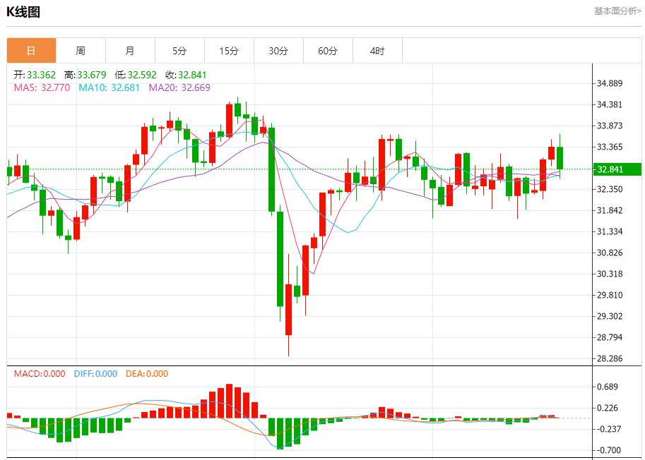 现货白银:截止北京时间20:28,现货白银下跌,现报32.852,跌幅1.54%。纽市盘前,(白银)价格在最近的盘中交易中下跌,在达到我们之前的报告33.70美元附近后,反弹走低,试图获得可能有助于突破该阻力的积极势头,并试图摆脱(RSI)上明显的超买状态,特别是在短期基础上的看涨趋势占主导地位以及沿着斜线交易的情况下,从那里出现了负面信号。