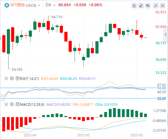 周五亚盘,原油交投60.68附近。由于市场对OPEC可能在7月上调产量的传闻感到担忧,投资者权衡供需前景,国际油价周四收跌,市场担心全球原油供应可能超过需求增长。据彭博社报道,石油输出国组织及其盟国(OPEC)正在讨论是否在6月1日的部长级会议上推动7月新增产量41.1万桶/日,但目前尚未达成最终协议。
