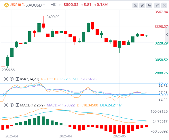 周五亚盘,黄金交投3300.32附近。国际金价近日迎来强势上涨,周三连续第三个交易日攀升,创下一周新高至3324.76美元/盎司,最终收报3315.14美元/盎司,单日涨幅约0.78%。这波上涨行情主要受到美元指数走软和全球地缘政治不确定性加剧的双重推动,显示出黄金作为传统避险资产的独特魅力。本交易日将出炉欧美国家5月份PMI数据、美国初请失业金人数变动、美国4月成屋销售年化总数,投资者需要予以关注,另外,继续关注国际贸易局势、地缘局势和G7会议相关消息,留意美联储官员的讲话。