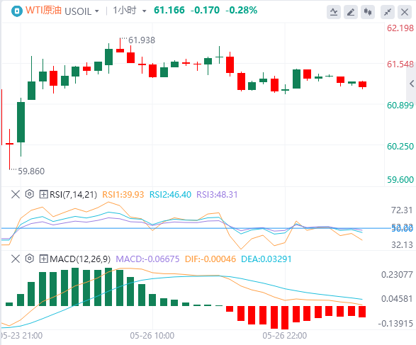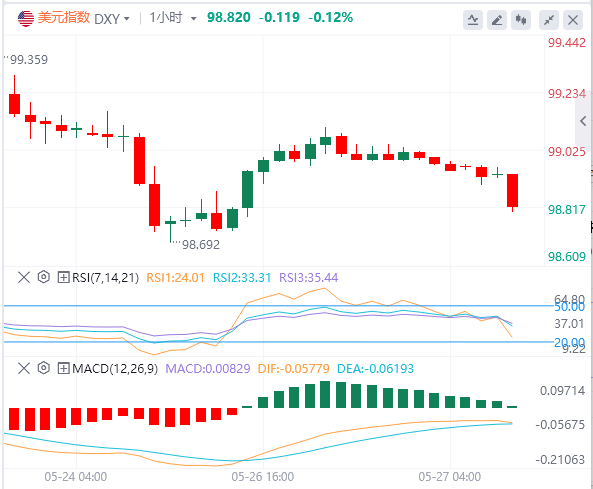 5月27日,北京时间周二亚市早盘,美元指数徘徊在98.82附近。周一,因特朗普政策大转弯,以及他目前正在推动的全面支出和减税议案令投资者对美国资产望而却步,美元指数持续下行,跌破99关口,最终收跌0.15%,报98.95。因特朗普暂停对欧盟征收高关税,市场避险情绪有所回落,现货黄金开盘下挫,盘中一度跌破3330美元,但在美盘收复部分失地,最终收跌0.42%,报3342.01美元/盎司。现货白银收涨0.01%,报33.47美元/盎司。油价周一保持稳定,有消息称欧佩克+将于5月31日举行会议,比原计划提前一天。?WTI原油在61美元上方来回震荡,最终收跌0.29%,报61.33美元/桶;布伦特原油收跌0.45%,报64.12美元/桶。