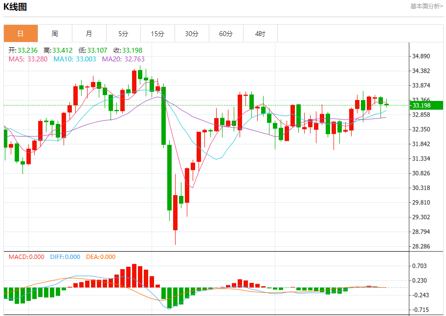 现货白银:截止北京时间20:20,现货白银下跌,现报33.195,跌幅0.13%。纽市盘前,(白银)价格在最近的盘中交易中上涨,受到(RSI)上积极信号出现的支持,尽管达到了超买水平,由于其交易高于EMA50而继续得到积极支持,短期内处于看涨趋势主导地位。
