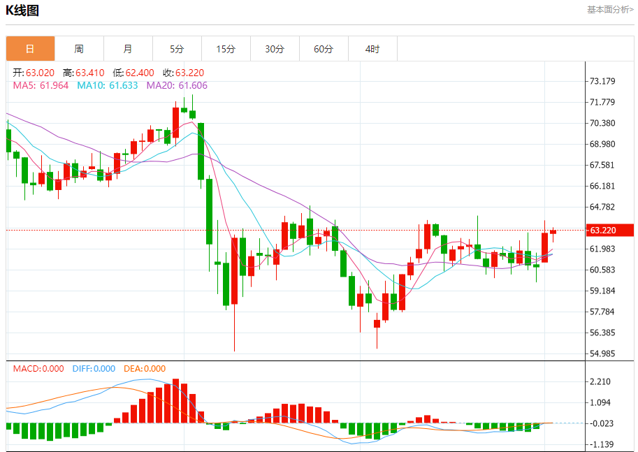 原油市场:截止北京时间20:20,美油上涨,现报63.210,涨幅1.12%。纽市盘前,(原油)的价格在最近的盘中交易中小幅上涨,试图在旨在获得积极势头以开始新一波看涨浪潮的波动站后恢复,价格正试图摆脱之前在(RSI)上明显的超买情况,并且它成功地做到了,在其EMA50上方交易的持续积极支撑中。
