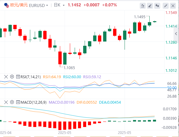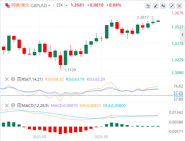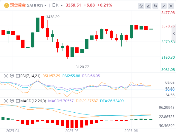 技术面:从日线图来看,黄金当前震荡于布林带中上轨之间,整体仍处于上升趋势中的整理阶段。价格在突破3300美元后暂时受阻于3430美元一线,该位为前期高位区域,亦为布林带上轨所对应的短线阻力。分析认为,若后续放量突破3430美元,则有望重新挑战3499.83美元的高点。MACD指标方面,快线(DIFF)与慢线(DEA)处于零轴上方,呈现温和金叉,柱状图微幅翻红,动能开始修复,暗示短线有进一步走强可能。相对强弱指数(RSI)目前徘徊在58附近,未出现超买信号,显示市场情绪相对中性偏多,为后续上涨保留空间。整体结构上看,黄金呈现明显箱体震荡格局,支撑位参考3300美元关口,阻力位关注3430美元水平;一旦突破,则上方空间有望进一步打开。
