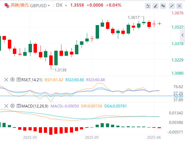 英镑:截止发稿,英镑/美元徘徊于1.3556附近。周一英镑兑美元在北美时段承压,交投于1.353附近。市场正在消化一系列即将出炉的英国本土数据与全球宏观风险事件,整体波动性或将放大。当前市场聚焦于本周即将公布的英国就业与GDP数据。英国4月失业率预期上升至4.6%,为自2021年7月以来高位,或加剧市场对英国经济放缓的担忧。与此同时,平均薪资年增率预估维持在5.5%,薪资粘性或强化通胀压力。技术面上,RSI仍处于温和区域,因此短期内有很大的动力空间。如果英镑/美元保持在1.3550水平上方,它将朝着阻力位1.3620–1.3640前进。