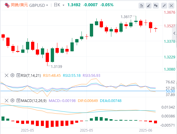 英镑/美元周二收于负值区域,因令人失望的劳动力市场数据令英镑承压。该货币对保持落后状态,周三欧洲早盘交易于1.3500下方。英国国家统计局将于周四公布4月份的月度工业生产、制造业生产和国内生产总值数据。
