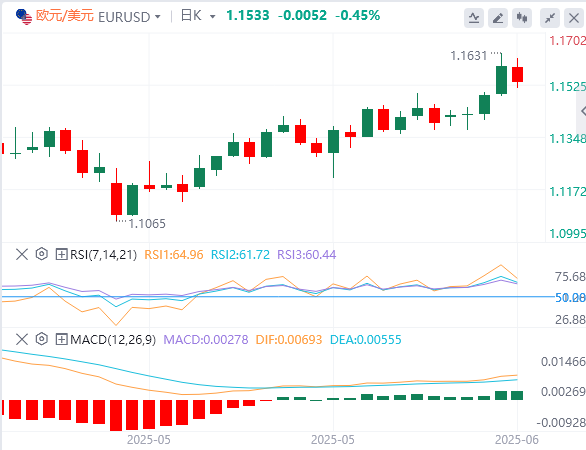 欧元/美元周四升至2021年11月以来的最高水平1.1600上方。该货币对周五早盘保持落后状态,交投于1.1550附近。欧洲经济日历将在交易日晚些时候提供4月份的工业生产和贸易差额数据。欧洲央行的几位政策制定者也计划发表讲话。