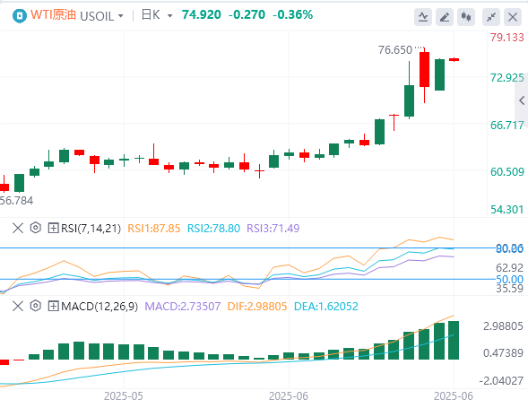 周三亚盘,原油交投74.92附近。随着中东紧张局势升级以及美国(US)卷入冲突的可能性增加,WTI价格延续了涨势。美国总统唐纳德·特朗普在他的社交媒体平台上发帖,呼吁伊朗“无条件投降”。在以色列和伊朗之间的紧张局势升级的情况下,人们担心美国将卷入冲突,这推高了WTI价格。此外,一名高级指挥官周六表示,主要石油生产国伊朗正在考虑关闭霍尔木兹海峡。反过来,这可能会在短期内推高原油价格。