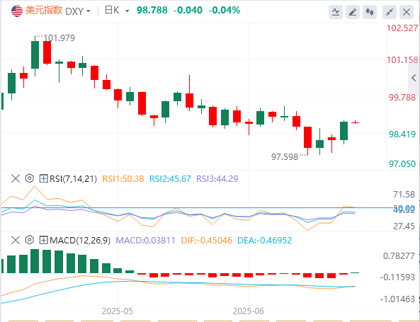 美元指数:截止发稿,美元指数徘徊在98.78附近。对以色列和伊朗之间战争升级的担忧提振了对避险资产的需求,但美元未能从这一背景中获得任何重大支撑。美元指数正在努力扩大涨幅,突破98.00水平,并仍然危险地接近上周触及的多年低点97.50。技术面上,如果美元指数成功收于98.59的50MA上方,它将向位于99.00–99.20区间的下一个阻力位移动