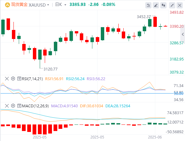 周三亚盘,黄金交投3385.93附近。由于美元整体走强推动黄金走低,尽管风险偏好恶化,但黄金价格周二回落至3400美元以下。尽管如此,以色列-伊朗冲突的升级可能会支撑贵金属,因为它具有避险吸引力。