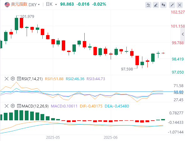 6月19日,北京时间周四亚市早盘,美元指数徘徊在98.86附近。周四凌晨,因美联储维持利率不变、暗示未来降息步伐会放缓,并预计未来几个月将出现“相当高的通胀”,美元指数一度站上99关口,最终收涨0.03%,报98.85。美债收益率先跌后涨,基准的10年期美债收益率最终收报4.3970%,2年期美债收益率收报3.9520%。现货黄金险守3370关口,最终收跌0.58%,报3370.20美元/盎司;现货白银最终收跌1.16%,报36.72美元/盎司。周三,特朗普称伊朗已与美国取得联系,美油闻声下挫。WTI原油日内一度大跌3%,后跌幅收窄,最终收跌0.93%,报73.07美元/桶;布伦特原油收跌1.27%,报76.03美元/桶。