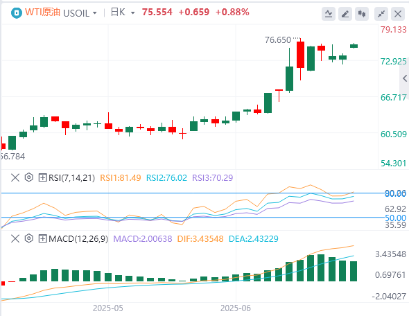 周一亚盘,原油交投75.53附近。受周末中东局势升级影响,WTI原油高开3.7%。美国国务院周日发布了全球安全警报,建议全球的美国公民“提高警惕”。美国国务院在美国袭击伊朗核设施后表示,“以色列与伊朗之间的冲突已导致中东地区旅行受阻和空域周期性关闭。此外,在海外针对美国公民和利益的示威活动也有可能发生。”