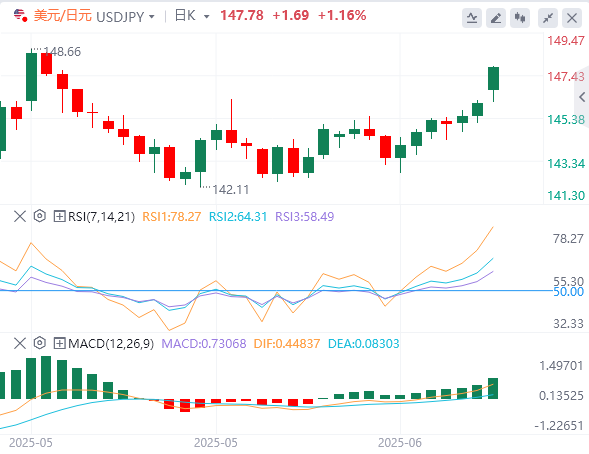 美元/日元周一上涨,交投于5月中旬以来的最高水平147.00上方。