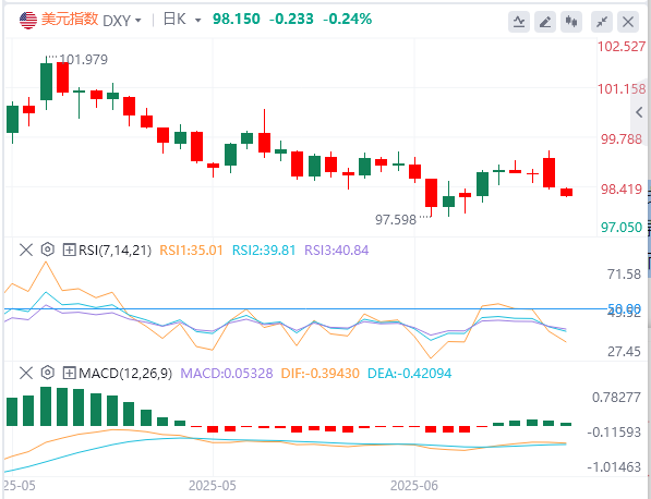 6月24日,北京时间周二亚市早盘,美元指数徘徊在98.15附近。周一,美元指数亚盘震荡、欧盘触及99.40,后因美盘期间美联储官员的鸽派言论下跌失守99美元关口,最终收跌0.43%,报98.35。基准的10年期美债收益率收报4.3490%,2年期美债收益率收报3.8700%。因伊朗在袭击前几个小时通知了美国和卡塔尔,特朗普称是时候实现和平,现货黄金尾盘转跌,最终收跌0.11%,收报3367.56美元/盎司;现货白银最终收涨0.14%,报36.07美元/盎司。因伊朗的报复力度不及投资者预想般严重,石油供应担忧缓解,国际原油暴跌逾8%。WTI原油最终收跌9.11%,报67.22美元/桶;布伦特原油收跌8.86%,报70.33美元/桶。