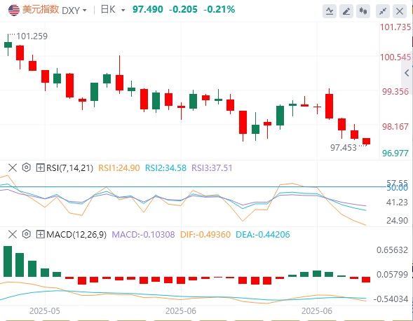 美元指数:截止发稿,美元指数徘徊在97.49附近。上周的地缘政治紧张局势支撑了美元。但随着特朗普总统庆祝以色列和伊朗之间的迅速解决,并对未来与德黑兰的外交表示乐观,风险情绪已经发生了转变。技术面上,美元指数继续尝试收于最近的支撑位98.00–98.20下方。如果美元指数保持在98.00水平下方,它将朝着下一个支撑位96.70–96.90迈进。