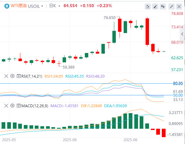 周四亚盘,原油交投64.56附近。在美国总统唐纳德·特朗普推动以色列和伊朗休战后,WTI价格继续下行。以色列和伊朗之间的停火令黑金承压。投资者预计,两国之间的休战将降低中东石油供应中断的风险,尽管休战仍然脆弱。