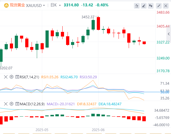 周五亚盘,黄金交投3314.80附近。尽管美元接近三年半低点,美国国债收益率暴跌,但黄金仍在努力反弹。(US)稳健的经济数据阻止了金价上涨,尽管市场参与者略微领先于自己,预计2025年底将降息两次。美国就业数据显示,美国申请失业救济人数低于预期,而5月份耐用品订单超出预期。2025年第一季度国内生产总值(GDP)的最终印刷证实,经济失去了牵引力,收缩幅度超过预期,幅度大于前值。