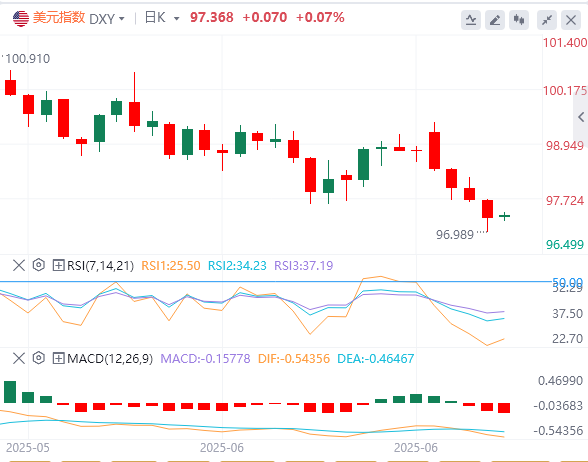 美元指数:截止发稿,美元指数徘徊在97.36附近。因为特朗普与鲍威尔的政策紧张局势抑制了其避险需求。美联储主席鲍威尔表示,在考虑降息之前,央行需要更多时间来衡量关税对通胀的影响。技术面上,美元指数最近的支撑位位于96.70–96.90区间。跌破该水平将推动美元指数跌至下一个支撑位95.40–95.60。